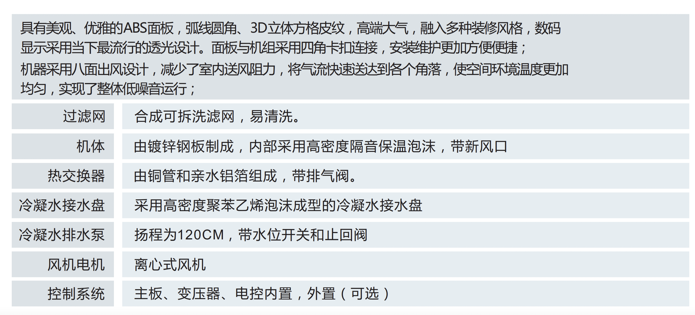 具有美觀、優(yōu)雅的ABS面板,弧線圓角、3D立體方格皮紋,高端大氣,融入多種裝修風(fēng)格。面板與機(jī)組采用四角卡扣鏈接,安裝維護(hù)更加方便便捷。